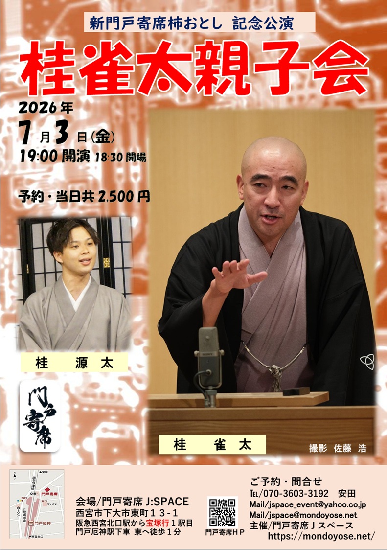 7月3日(金) こけら落とし記念公演第8弾 桂雀太親子会 公演番組案内 2026.04.25 7月3日(金) 19:00開演 18:30開場 桂雀太親子会 出演 桂雀太 桂源太 予約・当日共2,500円